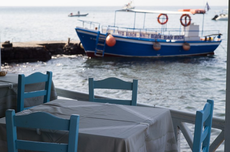 Terzo giorno, obiettivo le tre spiagge segnalate dalla guida : Red beach, White beach e Black beach, le ultime due raggiungibili solo tramite barca… Arriviamo al piccolo porticciolo di Akrotiri dove imbarcarci verso le 9.30…. Scopriamo che la prima traghettata parte alle 10.30… E ci facciamo una bevuta al bar…